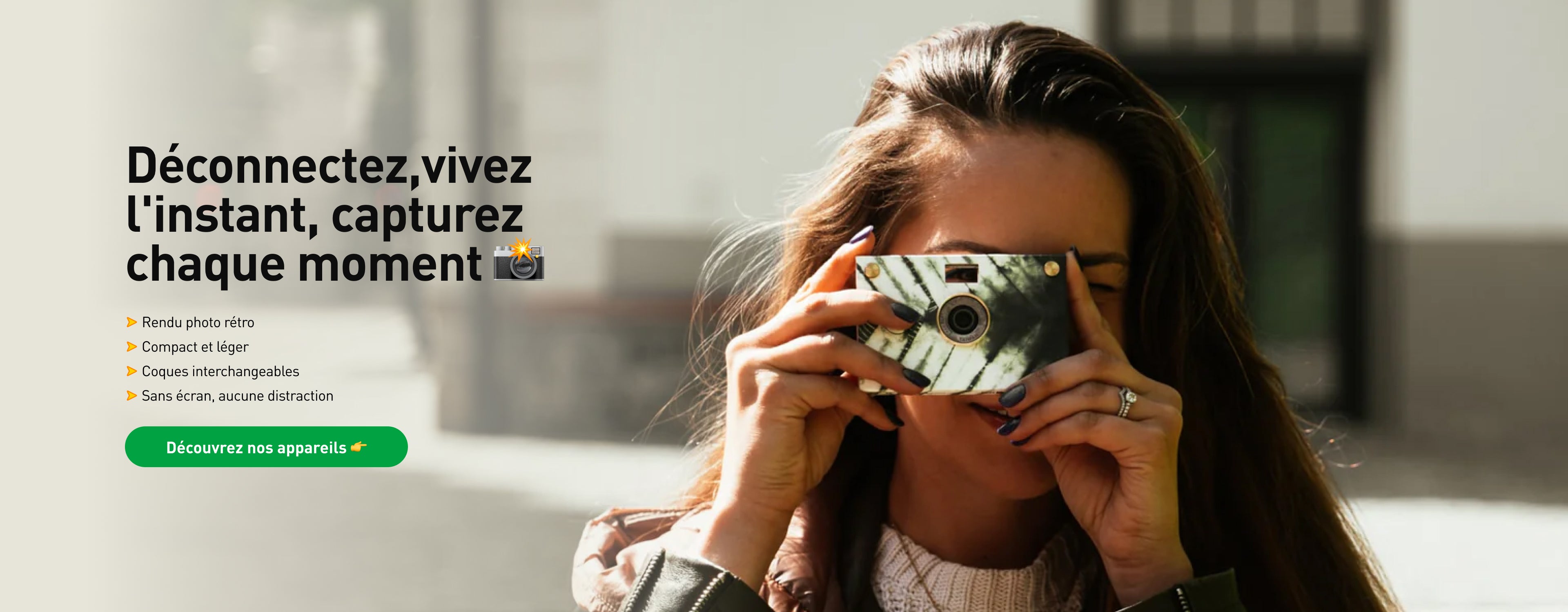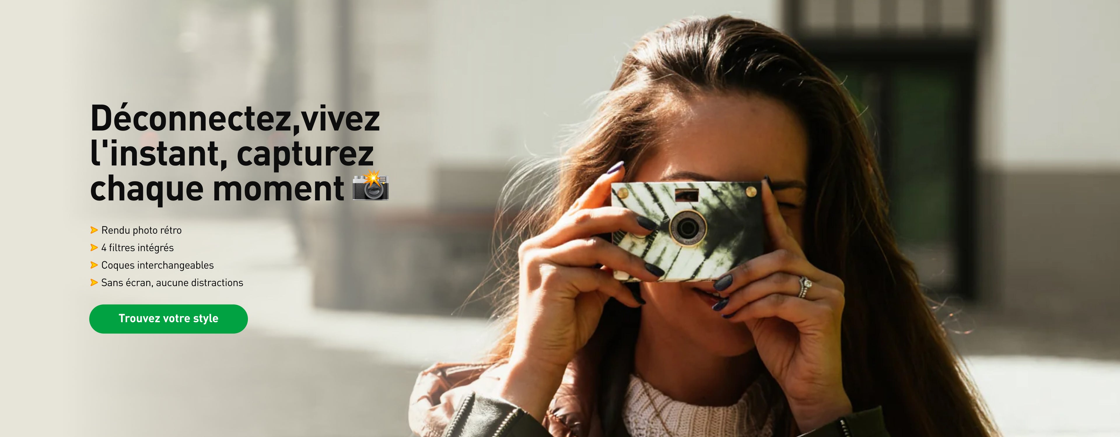 Notre appareil photo numérique, sans écran, vous permet de déconnecter, de vivre l'instant présent et de capturer tous vos souvenirs préférés avec un rendu vintage.